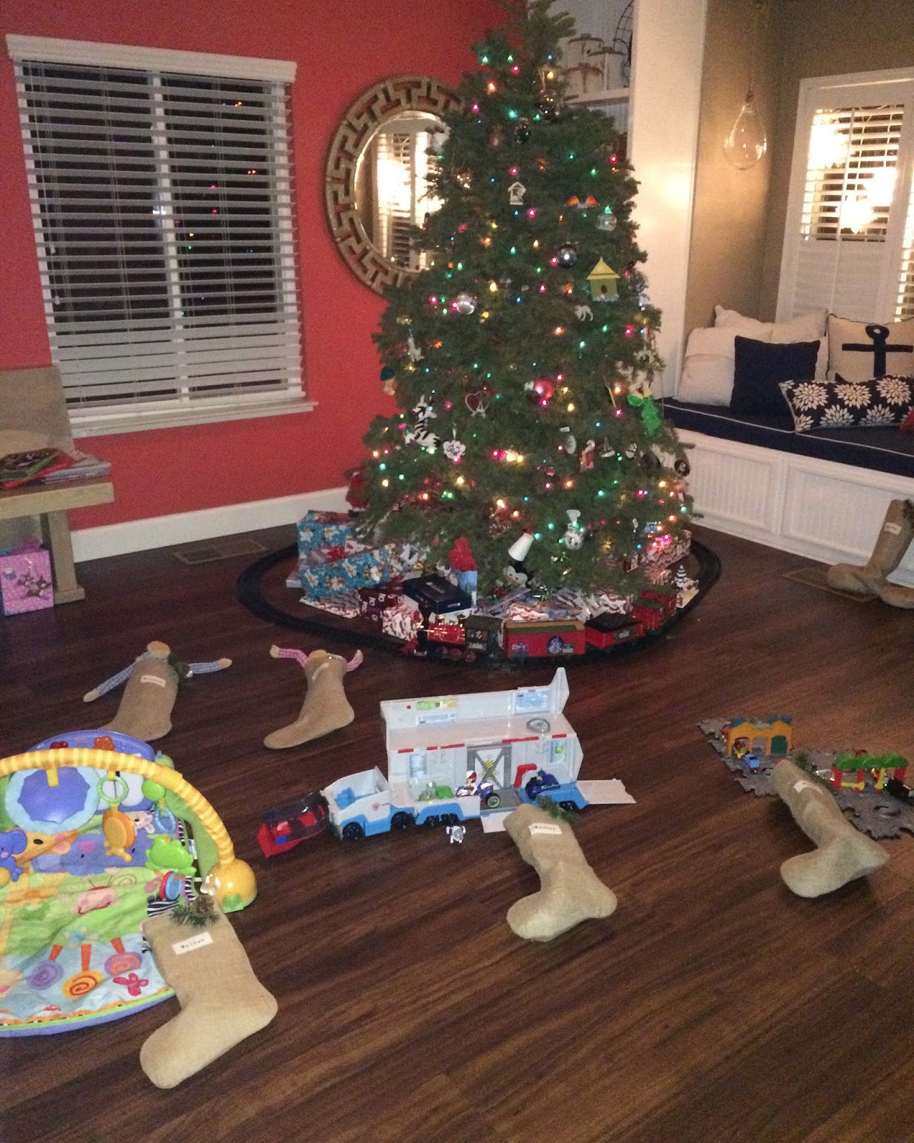 This year we headed over to Mission Solano to help with the food feast during Christmas Eve day and then over to the Emigh Christmas Eve celebration. We managed to fit a gift exchange in with Grandma and Papa and a playdate with Patrick as well. The time at Mission Solano was wonderful- it was great having our whole family there to serve and an experience I am hoping we can share in again, hopefully more often than just the holiday season. The gift exchanging and Christmas Eve festivities went well too- the boys loved the visit from Santa and Walker enjoyed his first Christmas celebration. Gabe and I wrapped up the night with some Christmas duties and off to bed everyone went, happy and healthy...well I woke up feeling not good and after trying to convince myself it was just exhaustion (a nap did not help!) I started to feel worse and worse as the day went on. I didn't get a picture of the Santa gifts, the boys' expressions opening stockings, or a family selfie in our holiday jammies...nothing but me miserably laying on the couch trying not to ruin everyone's time. We managed to hit up Candy Cane lane even though I hadn't ate anything all day and then I barely made it home before I was sick sick sick...by the next morning I felt much better and then learned that 21 people from our Christmas Eve celebration had fallen ill and three days post Christmas both my parents ended up sick as well...whatever went through the party was knarly and I am soooo happy I was the only one who got it! Until next year, this will be what we have for Christmas memories and the only documentation of Walker's first Christmas!